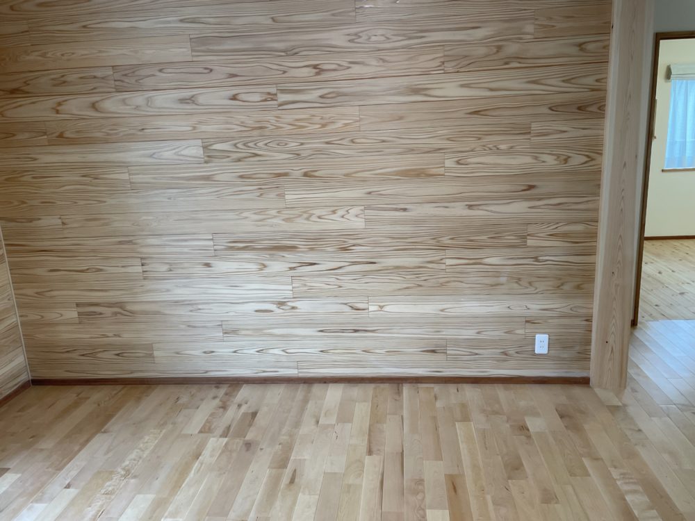 リビング壁面には13センチ以上の幅の広い杉板が使われています。