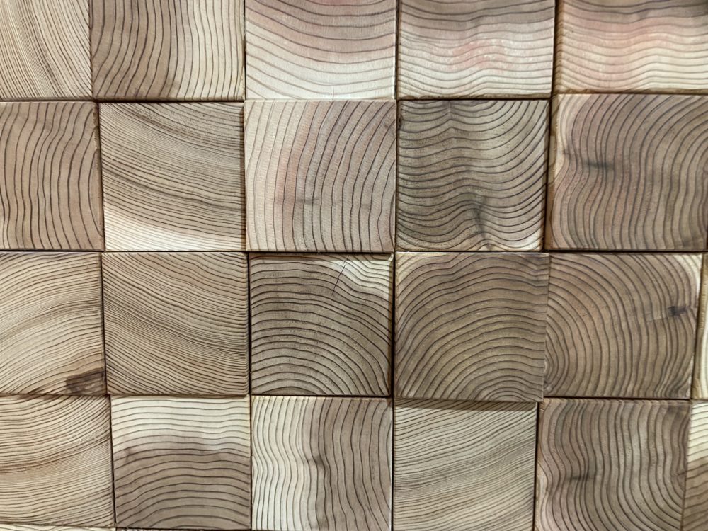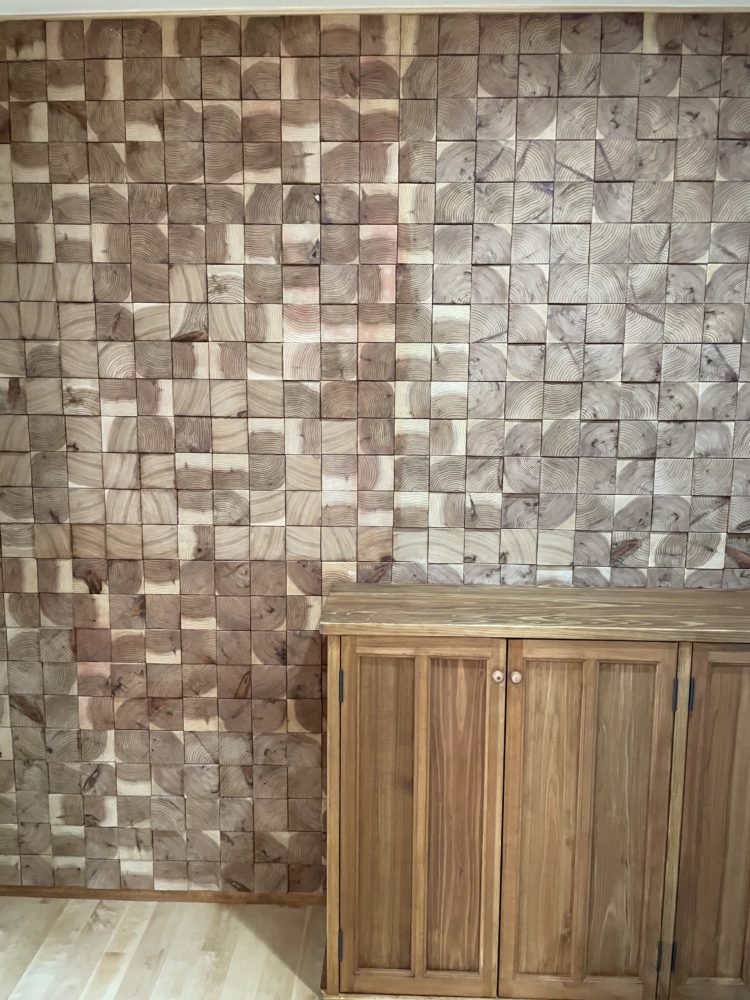 壁面には今回の現場で使われた構造材部材の柱を10センチ~15センチにカットし壁材として使用されておりました。