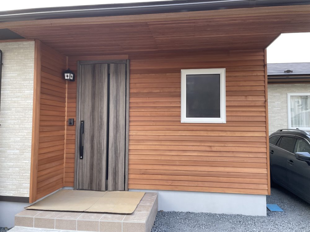 現場にすぐ目についたのは、玄関右手にある壁材です。