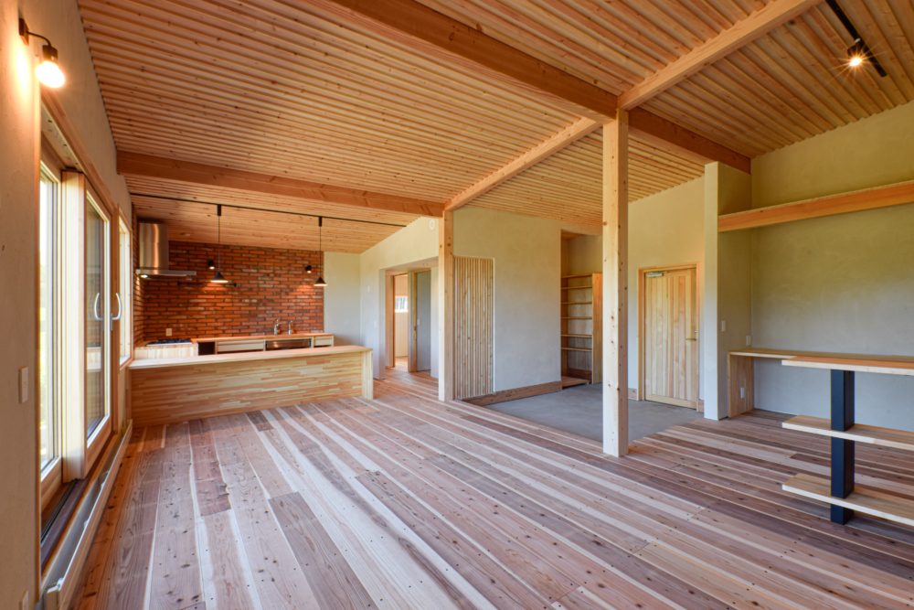 「天井にはアクセントとして、県産赤松を使用しました。全体は70平米とコンパクトですが、素晴らしい景色を楽しめるように、リビングから連続でウッドデッキにつながる設計にしました」