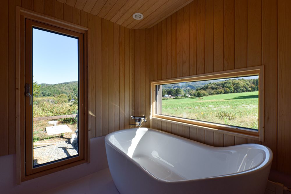「施主様は県外からの移住者で、遠野の原風景を楽しみながら、過ごしたいとのご要望がありましたので、浴室からもウッドデッキに出入りが出来るように工夫しました。デッキで涼みながら美味しく一杯、せっかくの移住なので、毎日の生活を楽しんで頂ければと思いました」